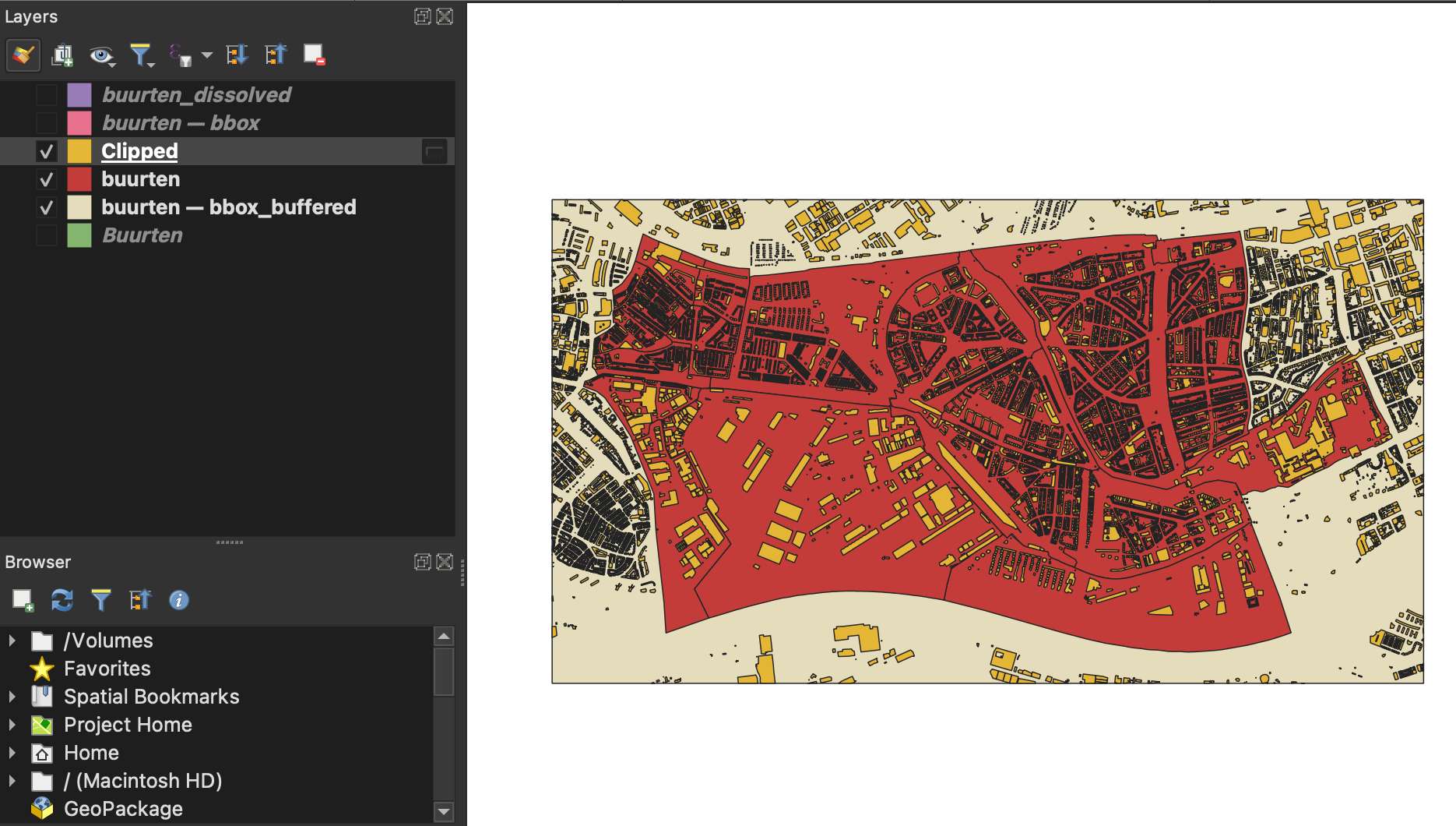 Why clip the data?The WFS layer contains data for all of Zuid-Holland province (thousands of buildings). Clipping reduces the dataset to only the buildings within our study area, making the data easier to work with and improving QGIS performance.
