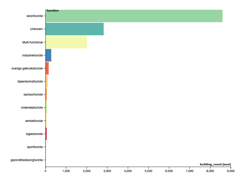 | Building Count by Function | Statistics by Categories | How many buildings of each type in each neighborhood? |