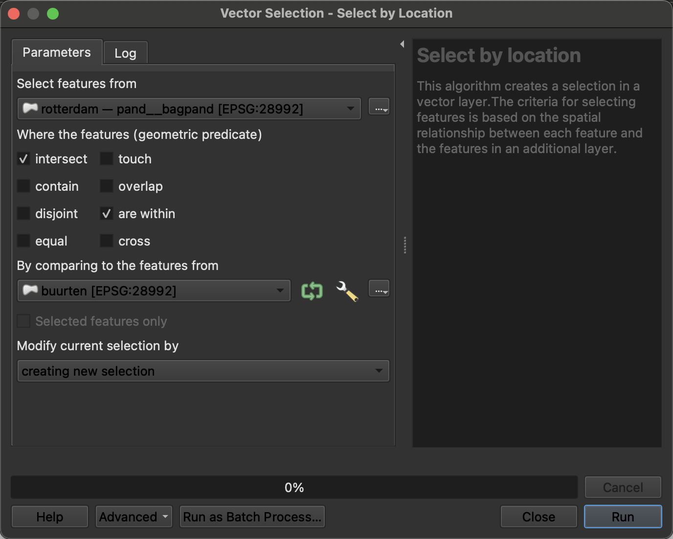 Solution: - Check your spatial selection first - Verify CRS matches for both layers - Use “intersects” instead of “within” if buildings are on boundaries - Inspect the map visually to confirm coverage