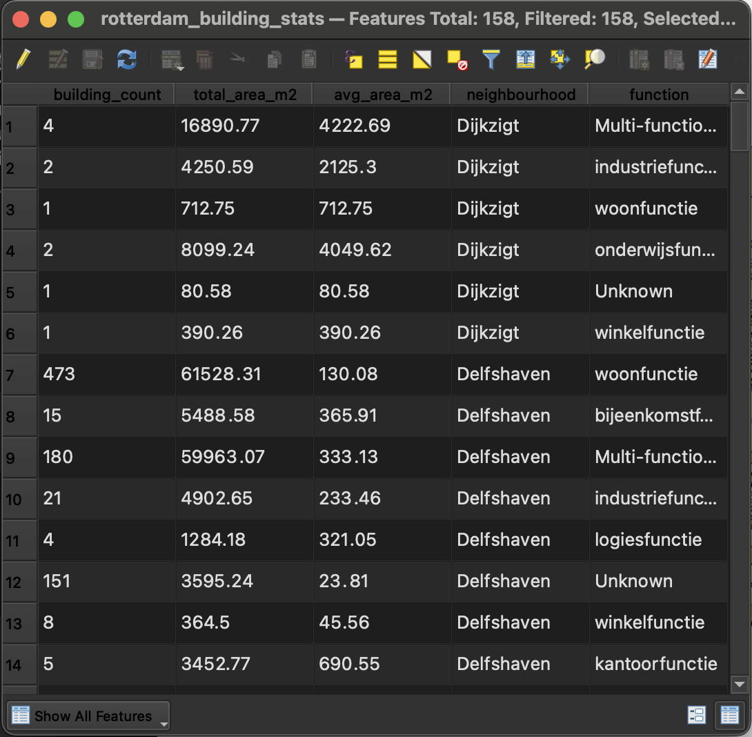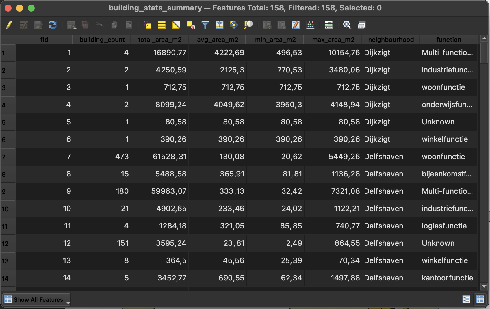function_typefield classifying single vs. multi-functional buildings - ☑ Performed spatial selection of buildings within neighborhoods