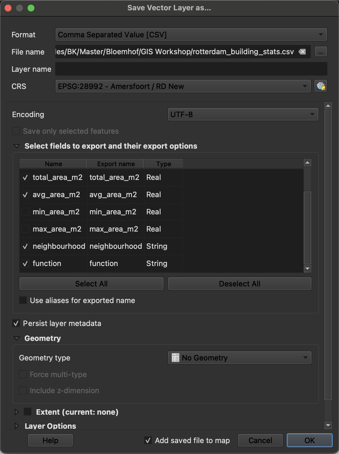 💡 Tip: If you want to keep only buildings within neighborhoods, you can export the selection as a new layer: Right-click buildings → Export → Save Selected Features As...